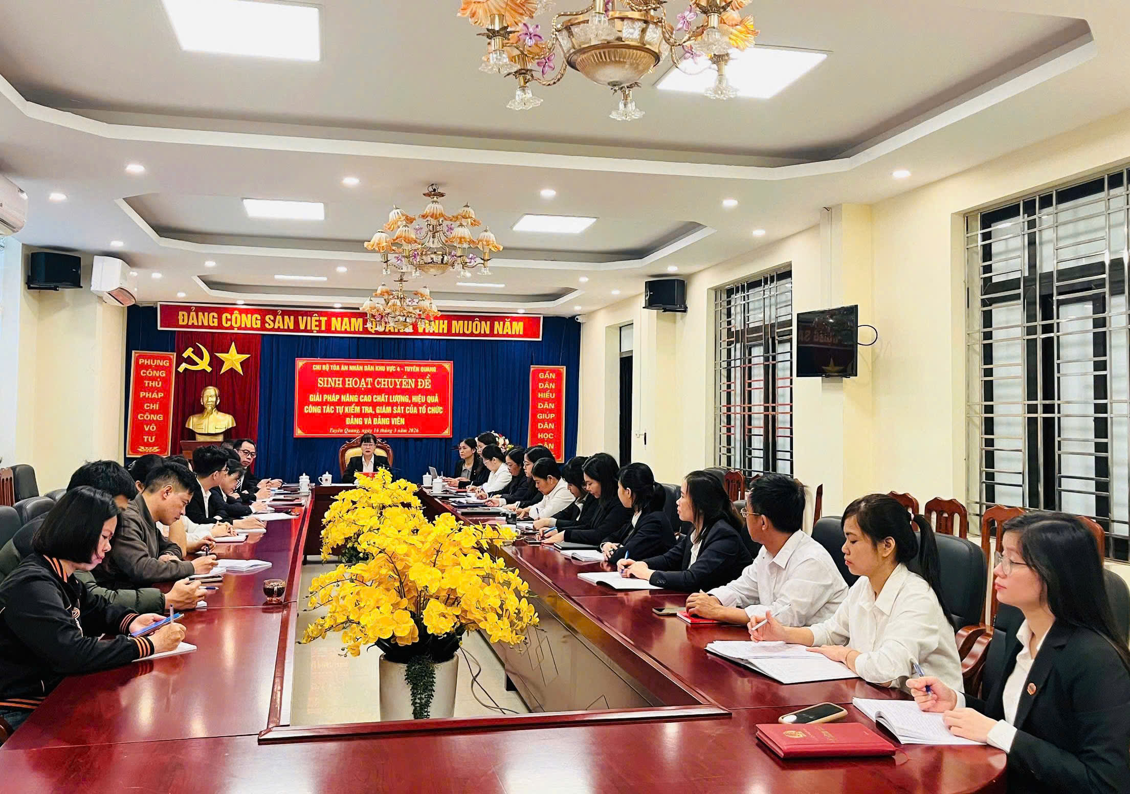 Ngày 16/3/2026, Chi bộ Tòa án nhân dân khu vực 4, trực thuộc Đảng bộ Toà án nhân dân tỉnh Tuyên Quang tổ chức sinh hoạt chuyên đề với nội dung: “Giải pháp nâng cao chất lượng, hiệu quả công tác tự kiểm tra, giám sát của tổ chức Đảng và đảng viên”. Dự buổi sinh hoạt có 28/28 đảng viên của chi bộ; đồng chí Lê Thị Thanh Bình, Bí thư Chi bộ, Chánh án Tòa án nhân dân khu vực 4 - Tuyên Quang chủ trì buổi sinh hoạt.
