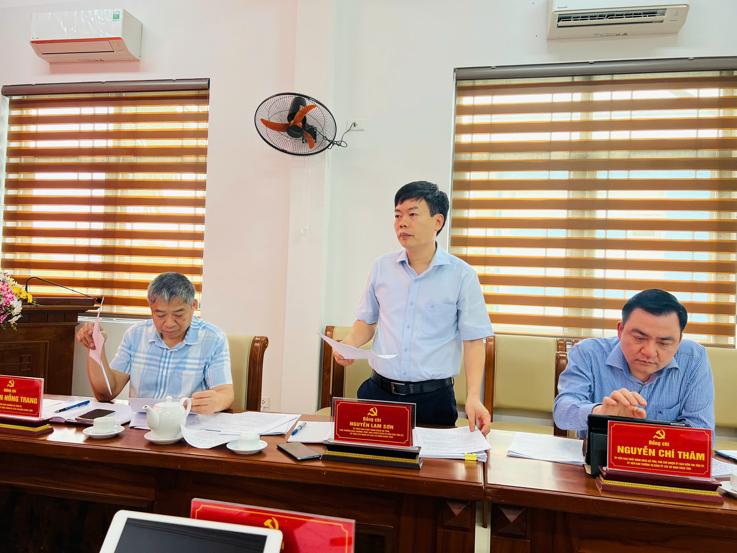 Đồng chí Nguyễn Lam Sơn, Ủy viên Ban Chấp hành Đảng bộ tỉnh, Ủy viên Ban Thường vụ Đảng ủy các cơ quan Đảng tỉnh, Phó Trưởng Ban Thường trực Ban Tuyên giáo và Dân vận Tỉnh ủy, Trưởng Ban Tuyên giáo và Dân vận Đảng ủy phát biểu tại hội nghị.