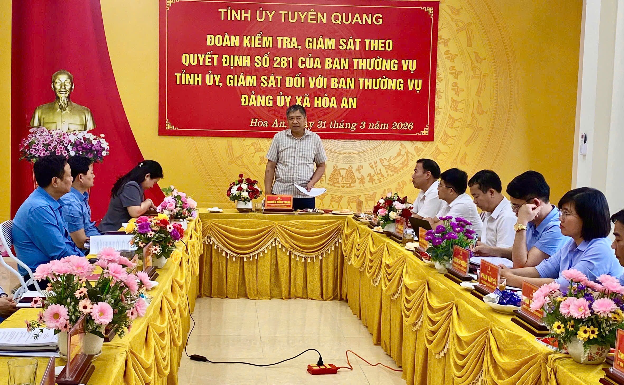 Tiếp tục thực hiện kế hoạch kiểm tra, giám sát năm 2026 của Ban Thường vụ Tỉnh ủy, chiều 31-3, Đoàn kiểm tra, giám sát do đồng chí Nguyễn Hồng Trang, Ủy viên Ban Thường vụ Tỉnh ủy, Phó Bí thư Thường trực Đảng ủy các cơ quan Đảng tỉnh làm trưởng đoàn đã có buổi giám sát về thực hiện lãnh đạo, chỉ đạo, tổ chức nghiên cứu, học tập, quán triệt, tuyên tuyền, triển khai và xây dựng chương trình hành động thực hiện Nghị quyết Đại hội Đảng các cấp; công tác cuộc bầu cử đại biểu Quốc hội khóa XVI và bầu cử đại biểu Hội đồng nhân dân các cấp nhiệm kỳ 2026 - 2031; việc vận hành chính quyền địa phương hai cấp và công tác quản lý đầu tư công tại xã Hòa An.