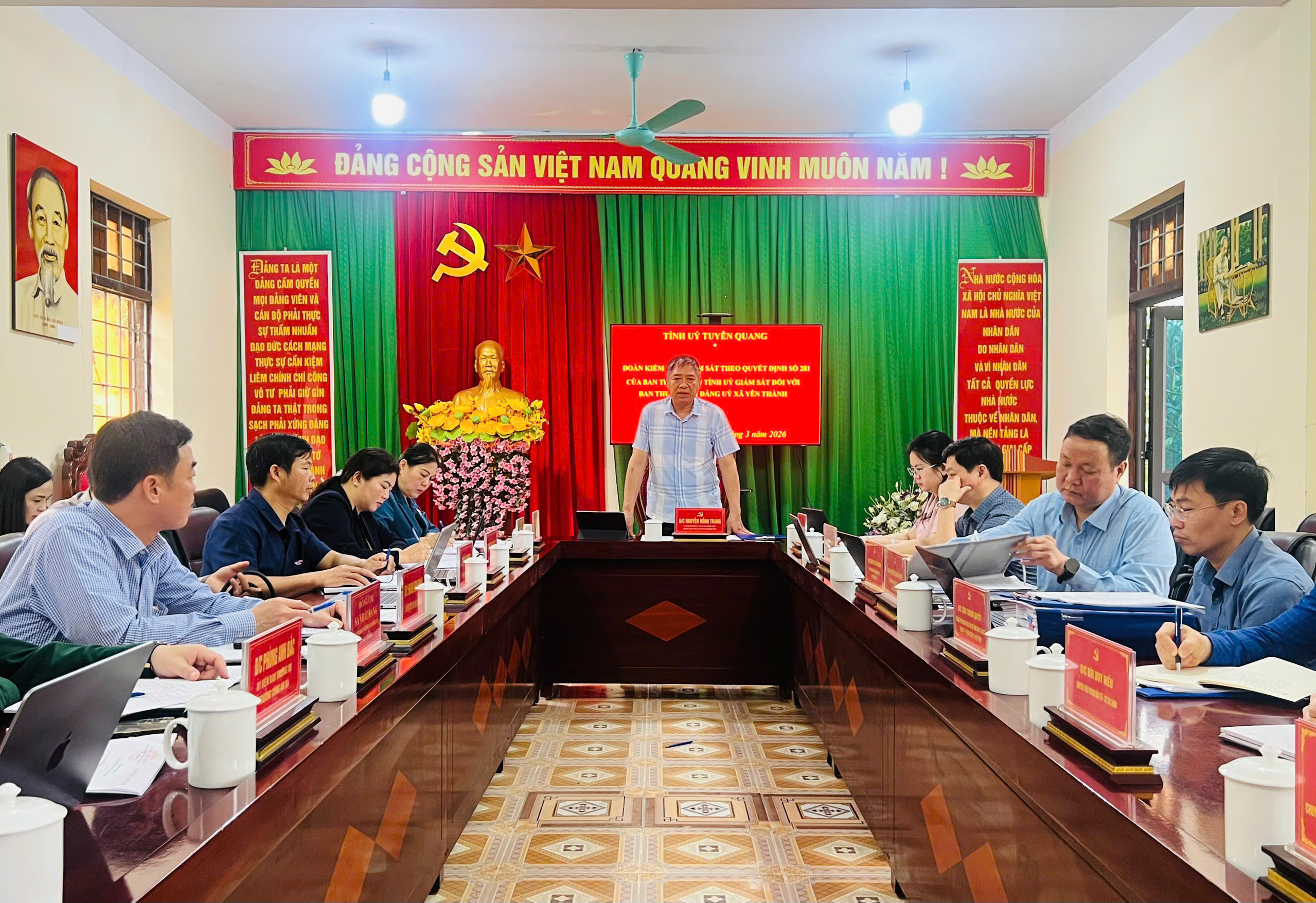 Ngày 24/3/2026, Đoàn kiểm tra, giám sát số 281 của Ban Thường vụ Tỉnh ủy do đồng chí Nguyễn Hồng Trang, Ủy viên Ban Thường vụ Tỉnh ủy, Phó Bí thư Thường trực Đảng ủy các cơ quan Đảng tỉnh Tuyên Quang làm Trưởng đoàn đã có buổi giám sát đối với Ban Thường vụ Đảng ủy xã Yên Thành. Tham gia đoàn có đồng chí Nguyễn Thu Hường, Phó Bí thư, Chủ nhiệm UBKT Đảng ủy các cơ quan Đảng tỉnh và các thành viên đoàn kiểm tra, giám sát.