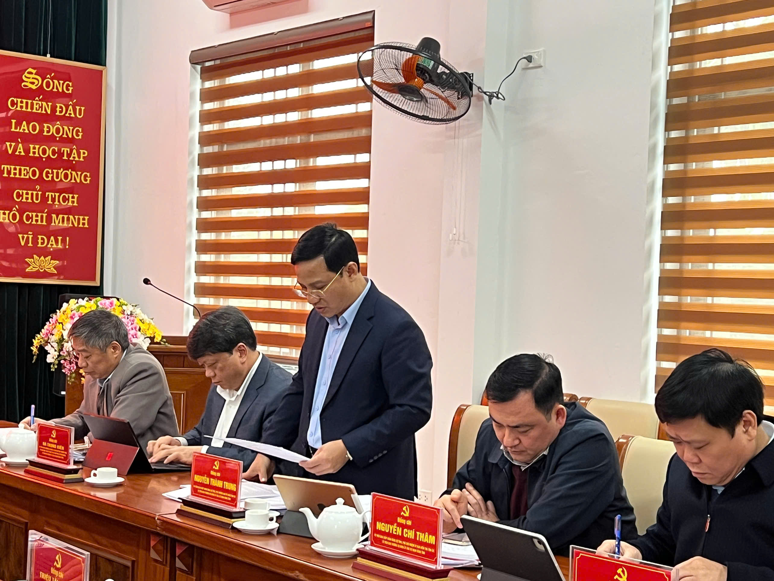 Đồng chí Nguyễn Thành Trung, Ủy viên BCH Đảng bộ tỉnh, Ủy viên BTV Đảng ủy các cơ quan Đảng tỉnh, Phó Trưởng Ban Tổ chức Tỉnh ủy, Trưởng Ban Tổ chức Đảng ủy trình bày tờ trình tại hội nghị